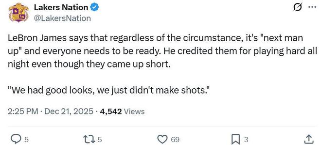 賽后詹姆斯也提及這一問題,直言:“無論發生什么情況,所有人都要有下一個頂上的心態,每個人隨時都要做好準備,盡管沒能取勝,但隊友們足夠努力,只是沒能命中那些機會不錯的投籃而已。”