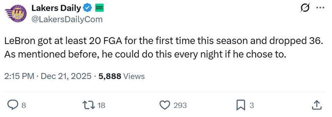 面對詹姆斯這樣的表現,湖人媒體Lakers Daily稱贊道:“詹姆斯本賽季首次出手20+就轟下36分,正如他此前自己所說,只要他愿意,他每晚依舊可以做到這一點。”