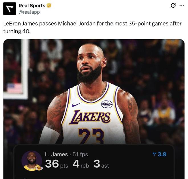 憑借這樣的表現,詹姆斯40歲之后第4場轟下35+得分表現,成功超越籃球之神喬丹獨占NBA歷史第一。