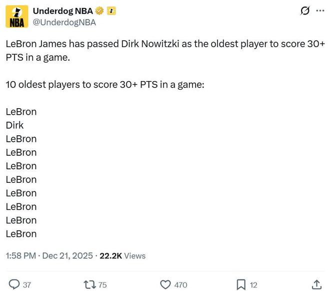 除此之外,40歲355天的詹姆斯超越40歲294天的諾維茨基,成為NBA歷史上單場砍下30+得分年齡最大的球員。